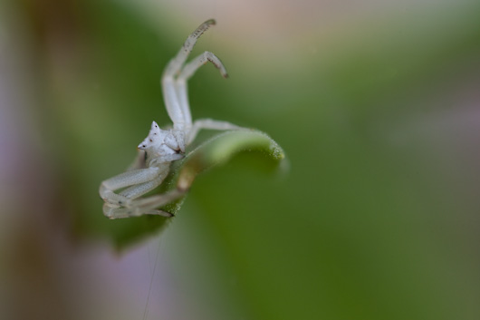 Dans le jardin de la location près de la piscine, se trouve une jolie thomise dans une marguerite au centre bleu. la marguerite est fermée la nuit et le jour elle ouvre ses pétale qui ont la même couleur que notre amie la thomise.