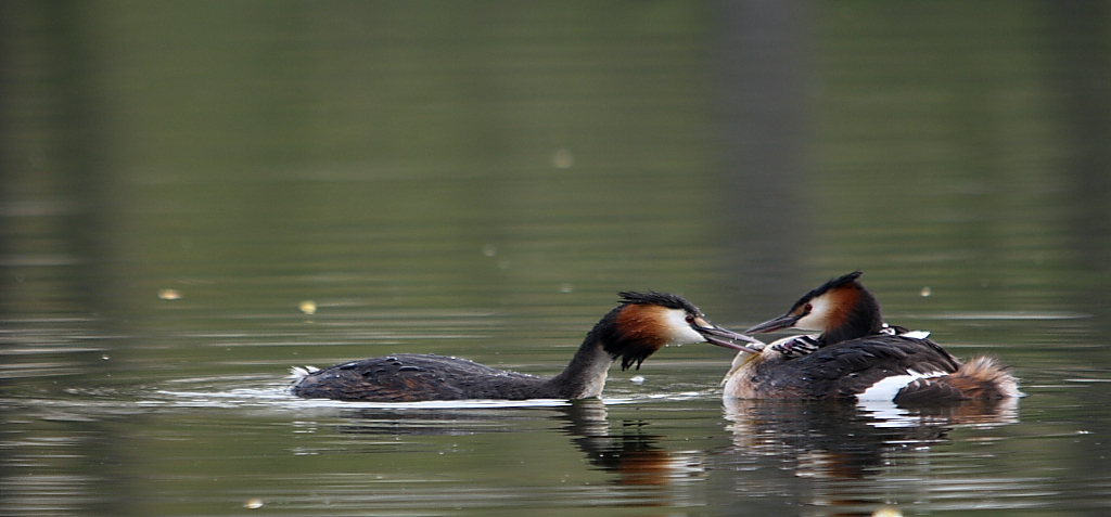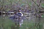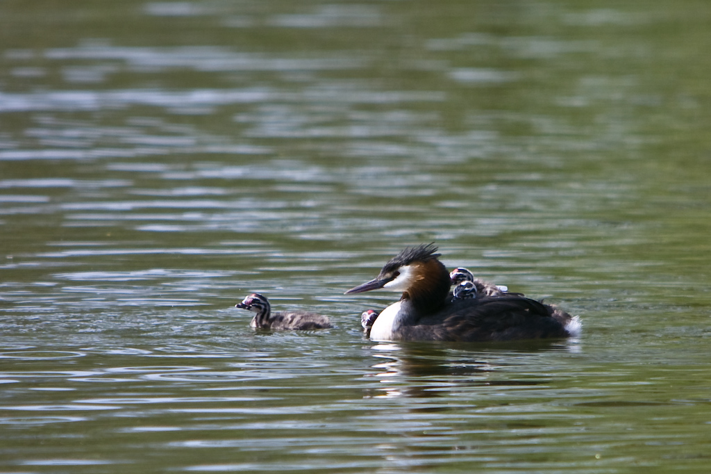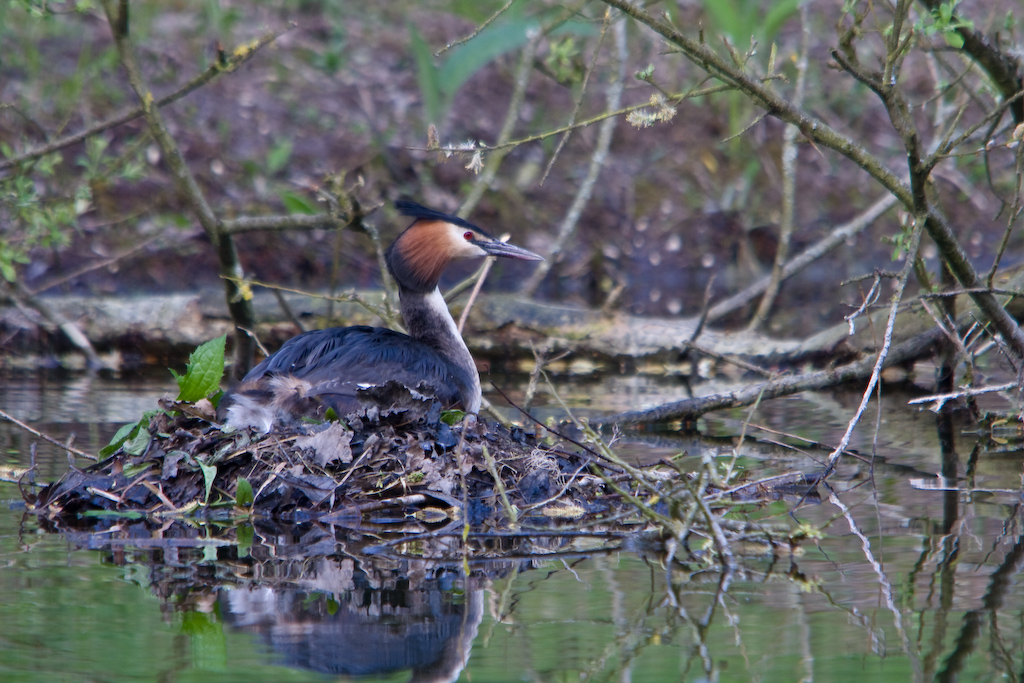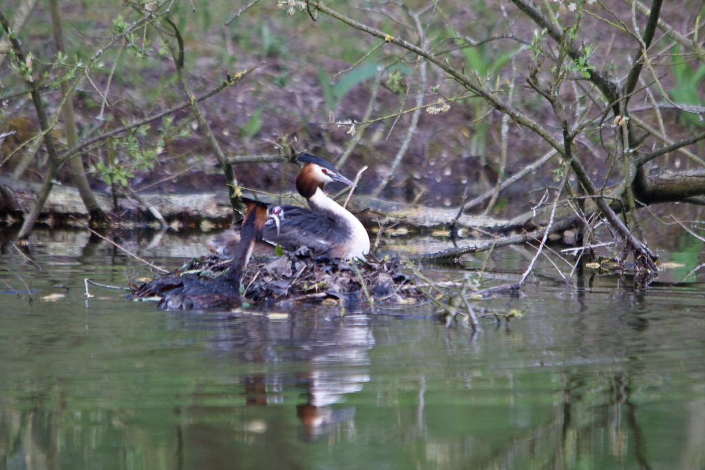 Je suis allé hier aux marais près d’ici, outre des pêcheurs qui rejettent leur prises à l’eau de toutes façons il y avait quelques couple de grèbes huppées un nid avec des oeufs mais aussi des petits et la le spectacle en vaut le peine !! des dizaines de photos à l’affut, à trier pour vier les floues mal cadrées et ratées. voici un exemple: