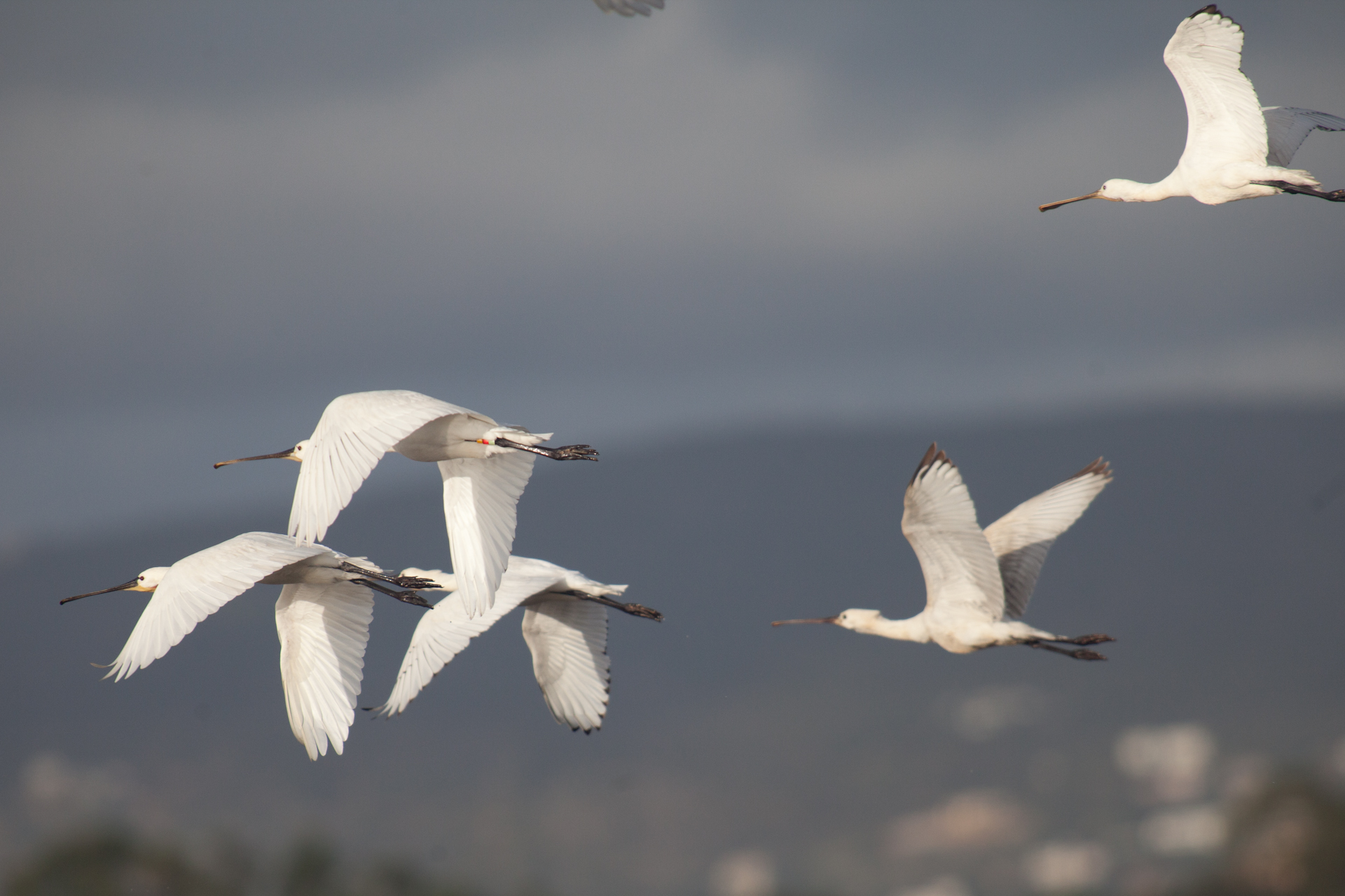 Vol de spatule blanche, certaines baguées d'autres non
